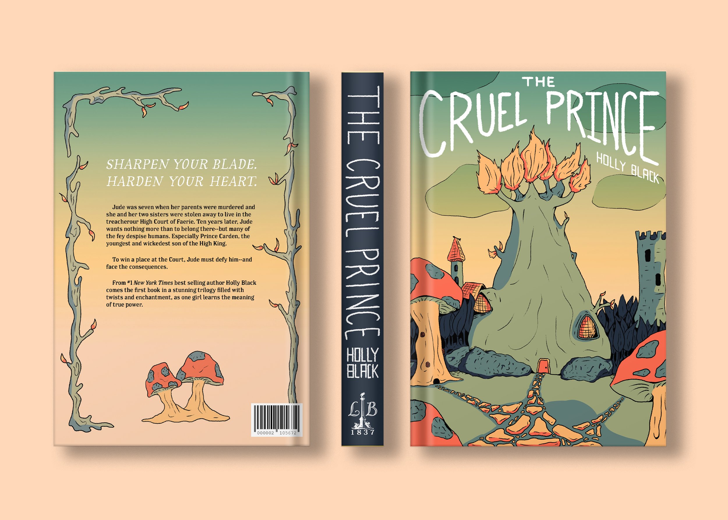 For this project, we were tasked with creating a book cover for an existing book. I chose ‘The Cruel Prince’ by Holly Black. The book is YA Fantasy and I wanted to incorporate that into my design. I focused on the environment of the series. The book is filled with nature not seen by ordinary humans, making it very mystical. This is about a young girl trying to find her place in a society where humans are disregarded.